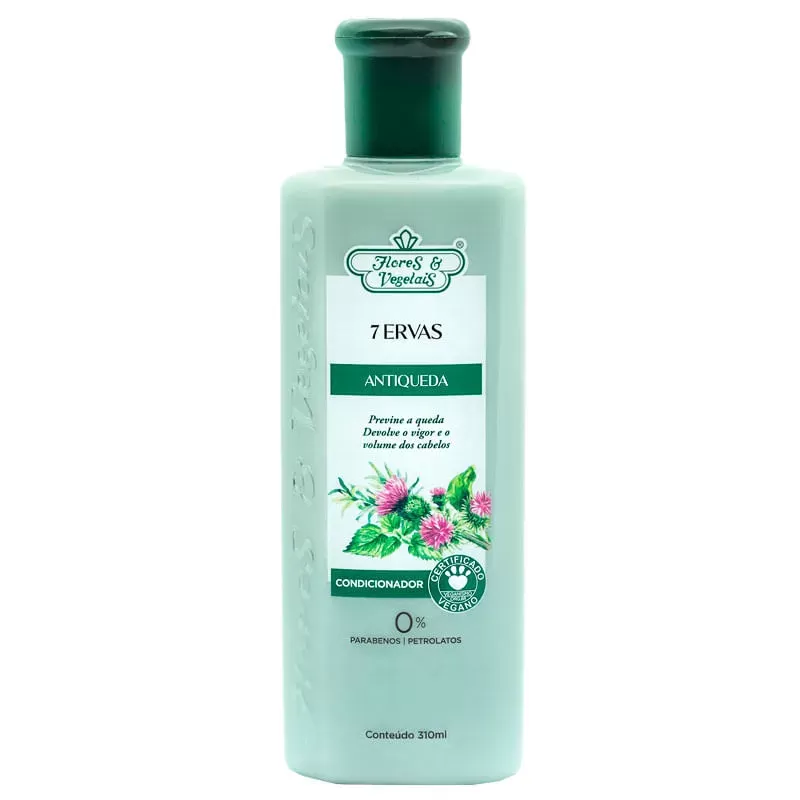 O Flores & Vegetais Condicionador Sete Ervas Antiqueda 300ml é formulado com um complexo vegetal ativo que reúne sete ervas poderosas: bardana, capsicum, hipérico, mutamba, quina, mirra e zimbro. Essa combinação atua diretamente no fortalecimento da fibra capilar, reduzindo a queda e promovendo vigor e volume aos fios. Com textura leve e fragrância herbal suave, é indicado para todos os tipos de cabelo, especialmente os enfraquecidos ou com tendência à queda. A embalagem prática de 300ml é ideal para uso diário e proporciona resultados visíveis desde as primeiras aplicações.