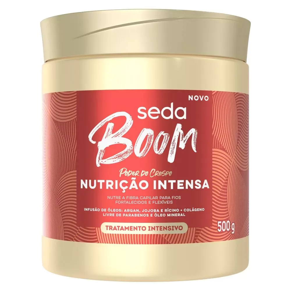 A Máscara de Tratamento Seda Boom Nutrição Intensiva 500g é um tratamento profundo indicado para cabelos crespos, cacheados e ondulados que precisam de força, elasticidade e nutrição. Sua fórmula é enriquecida com óleos vegetais (argan, jojoba e rícino) e colágeno, que juntos promovem hidratação intensa, resistência e definição dos fios. Com textura cremosa e fragrância suave, é ideal para uso semanal ou como parte do cronograma capilar. Produto vegano, liberado para técnicas low poo, sem sulfatos, parabenos ou óleo mineral.
