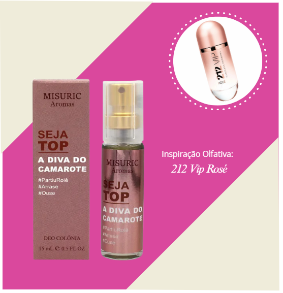 O Misuric Seja Top Diva Perfume Feminino 15ml é inspirado no sofisticado 212 VIP Rosé de Carolina Herrera, trazendo uma fragrância floral frutada com toque levemente amadeirado que exala feminilidade, elegância e presença. Com notas de champagne rosé, flor de pêssego e almíscar branco, é ideal para mulheres que gostam de se destacar com charme e autenticidade. A embalagem de bolso com 15ml é prática e moderna, perfeita para reaplicações ao longo do dia ou em eventos especiais. Vegano, cruelty-free e produzido no Brasil, é uma excelente escolha para quem busca um perfume de alta qualidade com ótimo custo-benefício.