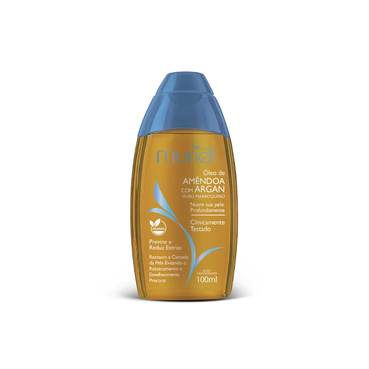 O Muriel Óleo Corporal Amêndoa com Óleo de Argan 100ml é um hidratante corporal com ação desodorante, desenvolvido para proporcionar hidratação intensa, perfume duradouro e prevenção de estrias. Sua fórmula rica em emolientes, óleo de amêndoas e óleo de argan oferece toque sedoso e aveludado, sem deixar a pele pegajosa. Pode ser usado dentro ou fora do banho, sendo ideal para todos os tipos de pele. A fragrância afrodisíaca e suave transforma o cuidado corporal em um momento de prazer e bem-estar. Produto vegano, livre de crueldade animal e com embalagem reciclável.