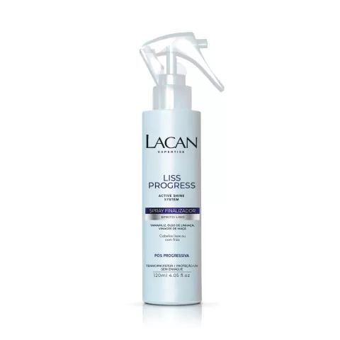 O Spray Finalizador Lacan Liss Progress 120ml é ideal para quem busca prolongar o efeito liso dos cabelos após procedimentos químicos. Com fórmula rica em óleos vegetais como óleo de coco, linhaça e crambe, além de extrato de uva e mirra, o produto promove hidratação profunda, sela as cutículas e protege a cor dos fios. Sua textura leve e fragrância sofisticada tornam o uso agradável e eficaz. Embalado em frasco spray prático, é indicado para todos os tipos de cabelo que passaram por alisamento ou escova progressiva.