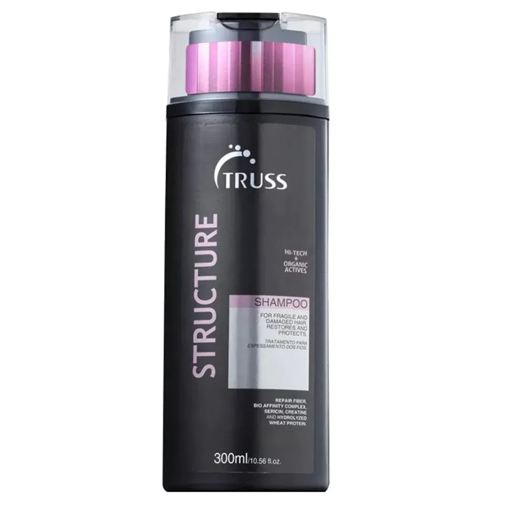 O Truss Professional Structure Shampoo 300mL é um shampoo de tratamento intensivo indicado para cabelos danificados, quebradiços ou quimicamente tratados. Sua fórmula avançada contém ativos como Bio-Cysteine, Nano Repair, Creatina e Panthenol, que atuam na reconstrução da fibra capilar, fortalecendo os fios e devolvendo sua elasticidade natural. Com textura cremosa e fragrância sofisticada, limpa suavemente sem agredir, preparando o cabelo para receber os demais tratamentos da linha. Ideal para uso profissional ou doméstico, o frasco de 300ml é prático e ergonômico, oferecendo resultados visíveis desde as primeiras aplicações.